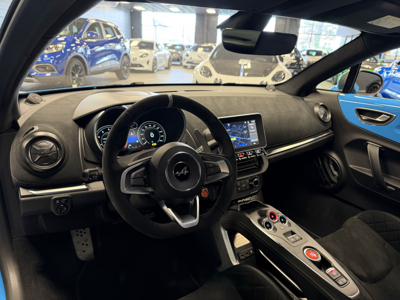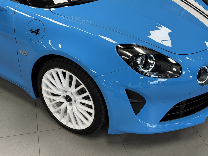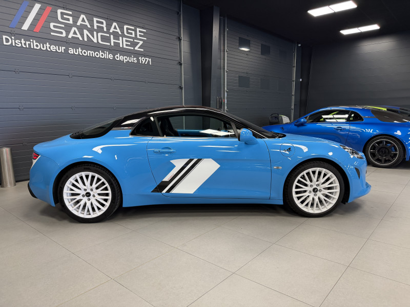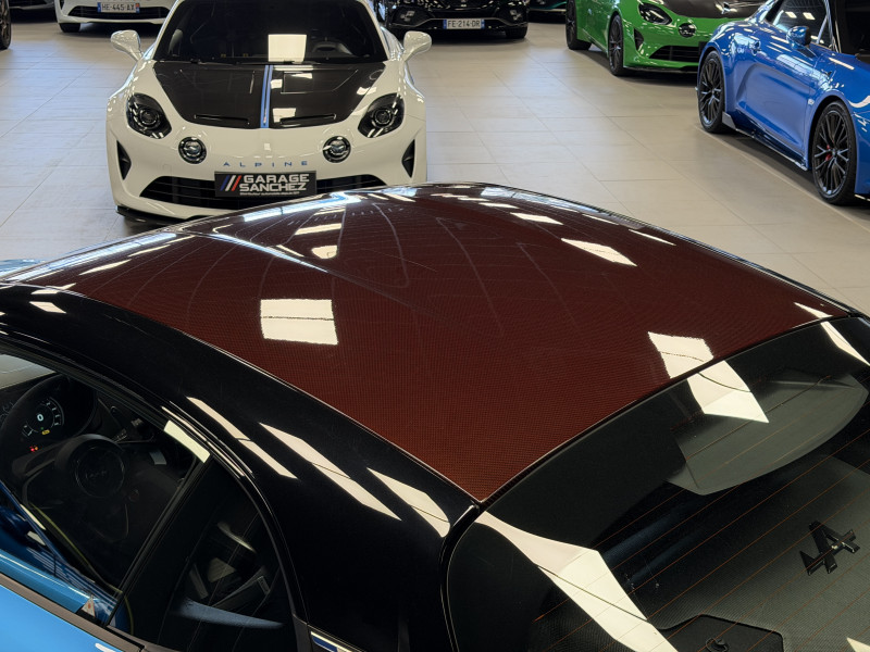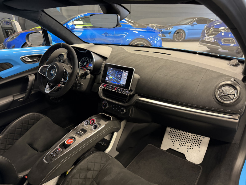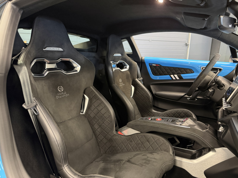Agent Renault vend une A110 San Remo 73 dans une configuration Bleu Caddy qui dispose du toit en carbone rouge, échappement sport, kit gros freins, jantes 18 GT Race Blanches avec les étriers de frein noir, black badge extérieur, fond des feux avant noir, pack Focal, pack carbone intérieur, pack microfibre, sièges Sabelt en cuir/alcantara, volant alcantara, ciel de toit dinamica, carte mains libre, rétroviseurs rabattables électriquement, rétroviseur intérieur éléctrochrome, pédalier aluminium, tapis de sol Alpine, régulateur/limiteur de vitesse, Apple CarPlay & Android Auto, GPS, radio, bluetooth, climatisation automatique