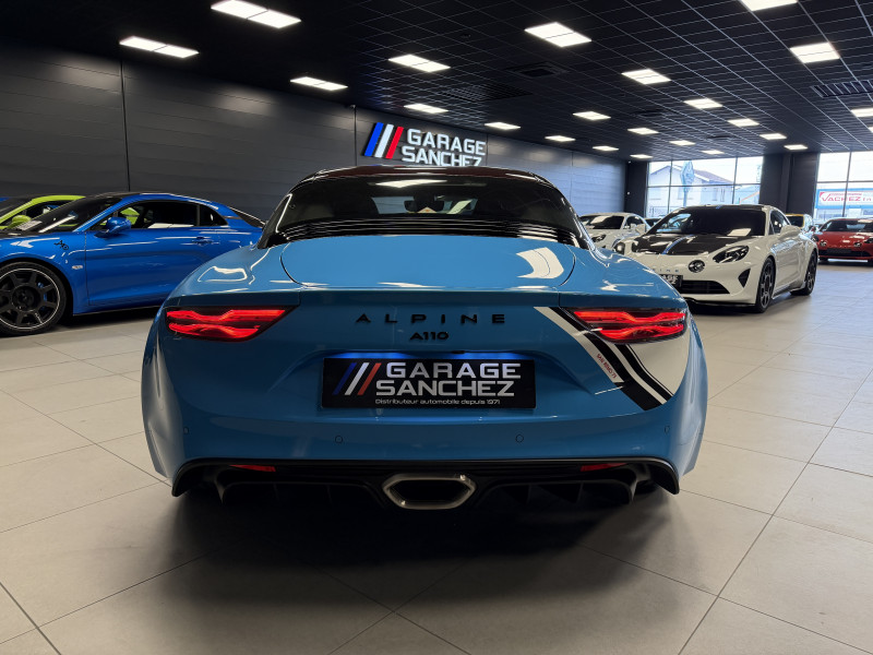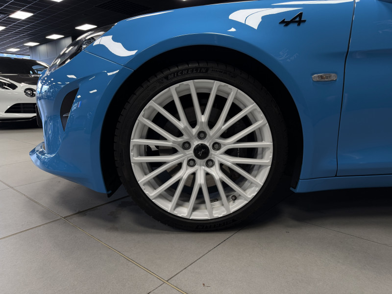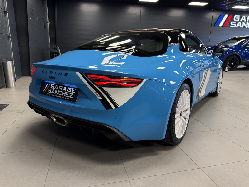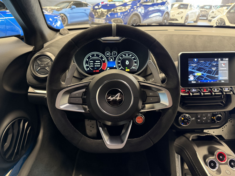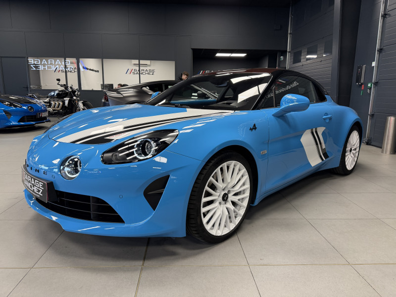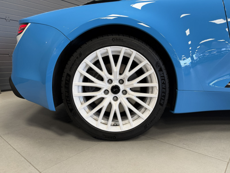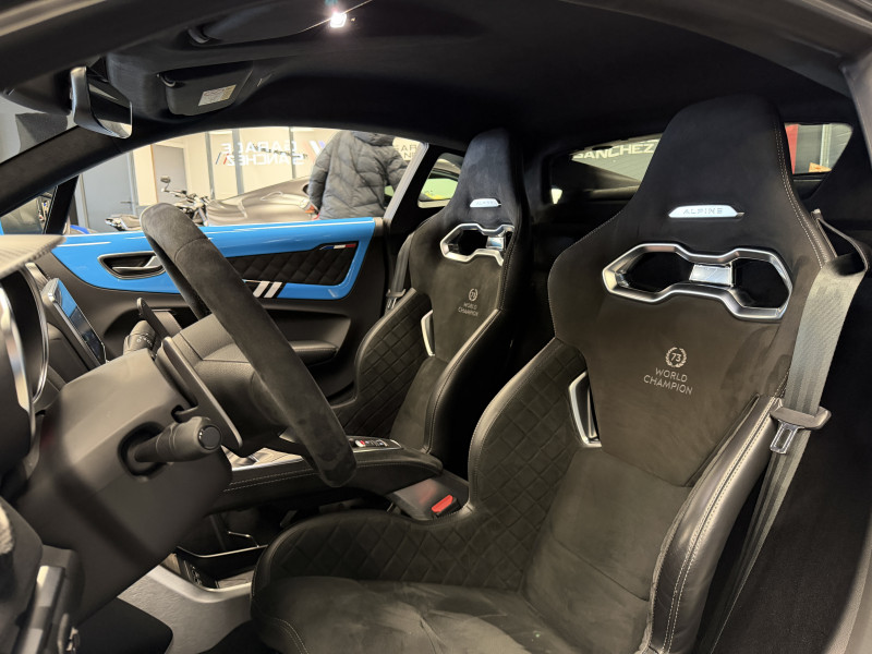 Agent Renault vend une A110 San Remo 73 dans une configuration Bleu Caddy qui dispose du toit en carbone rouge, échappement sport, kit gros freins, jantes 18 GT Race Blanches avec les étriers de frein noir, black badge extérieur, fond des feux avant noir, pack Focal, pack carbone intérieur, pack microfibre, sièges Sabelt en cuir/alcantara, volant alcantara, ciel de toit dinamica, carte mains libre, rétroviseurs rabattables électriquement, rétroviseur intérieur éléctrochrome, pédalier aluminium, tapis de sol Alpine, régulateur/limiteur de vitesse, Apple CarPlay & Android Auto, GPS, radio, bluetooth, climatisation automatique