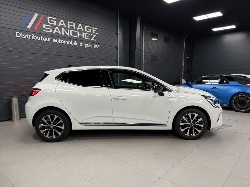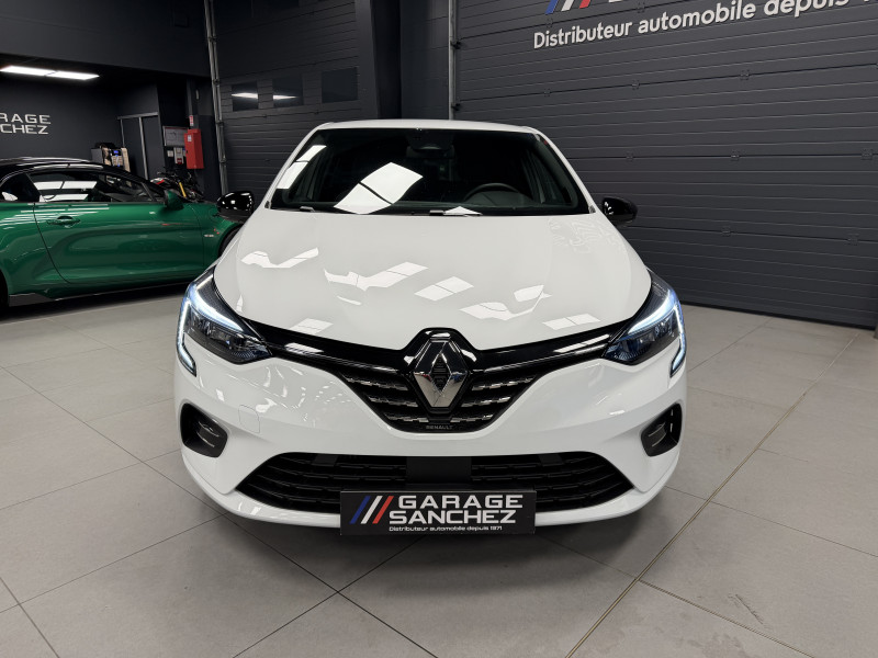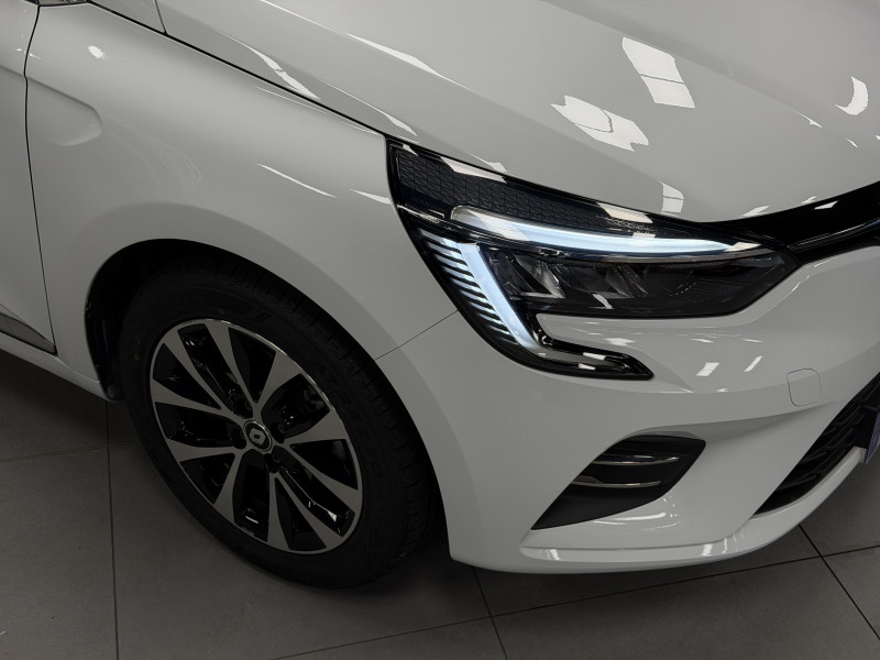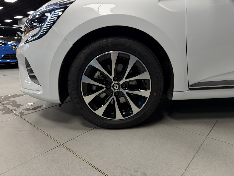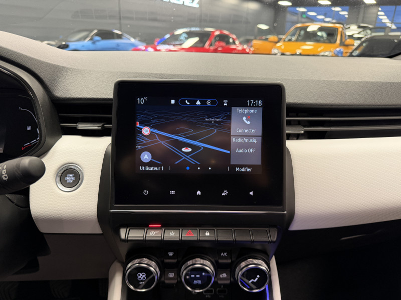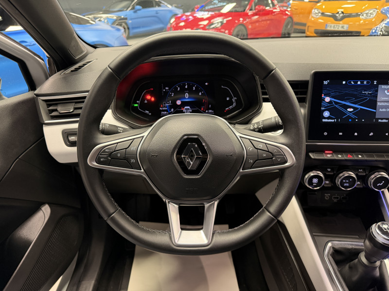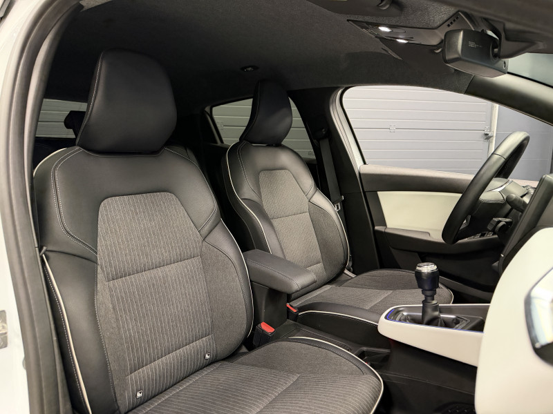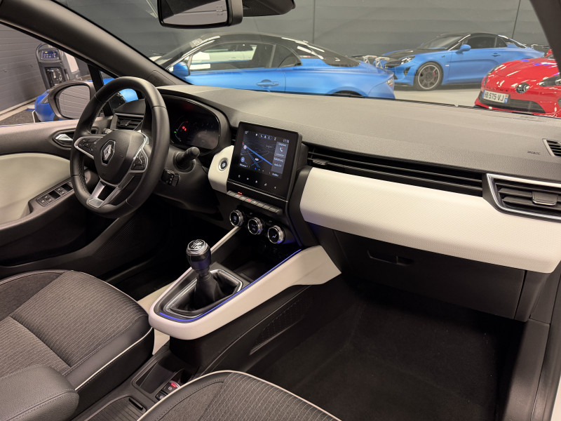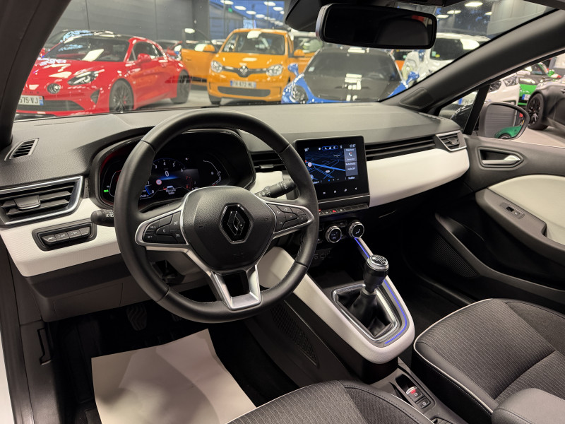 Agent Renaut vend une Clio 5 dans une configuration Blanc Glacier qui dispose de la caméra de recul, radars de recul arrières, jantes 16 Diamantées Noires, coques de rétroviseurs noir, antenne requin, virtual cockpit, sellerie cuir/tissu bi-ton gris et noir, intérieur noir, ciel de toit noir, pack ambiance lumineuse, alerte de franchissement de ligne, maintien de voie, régulateur/limiteur de vitesse, Apple CarPlay & Android Auto, GPS, radio, bluetooth, climatisation automatique