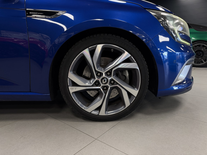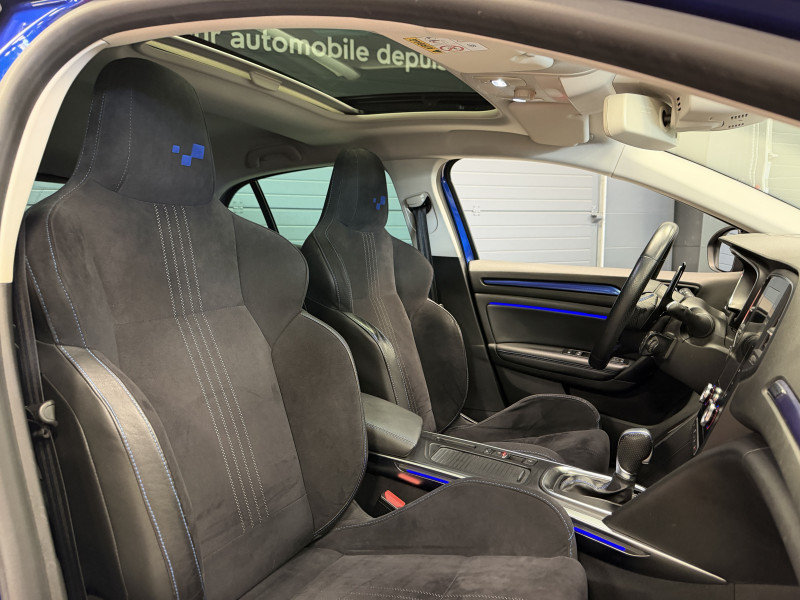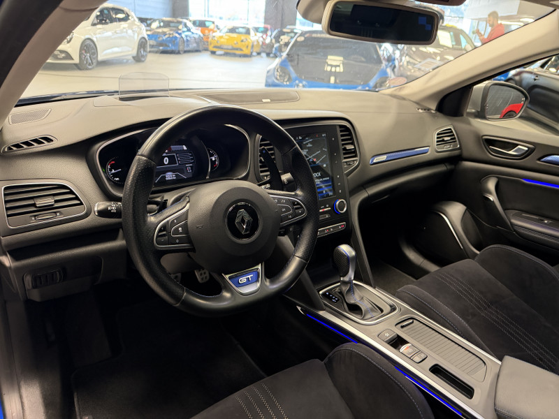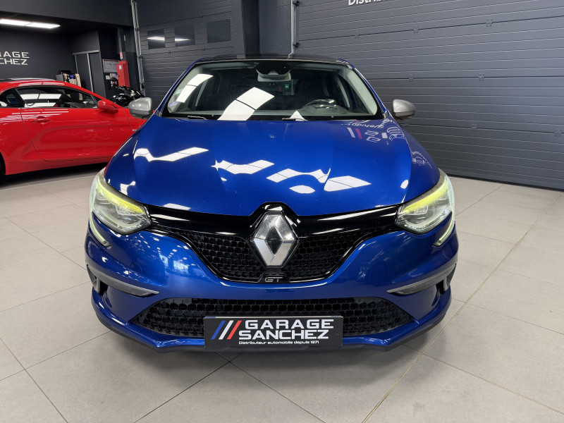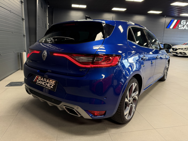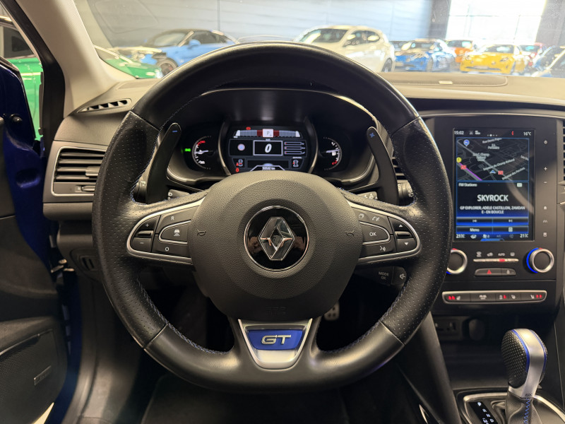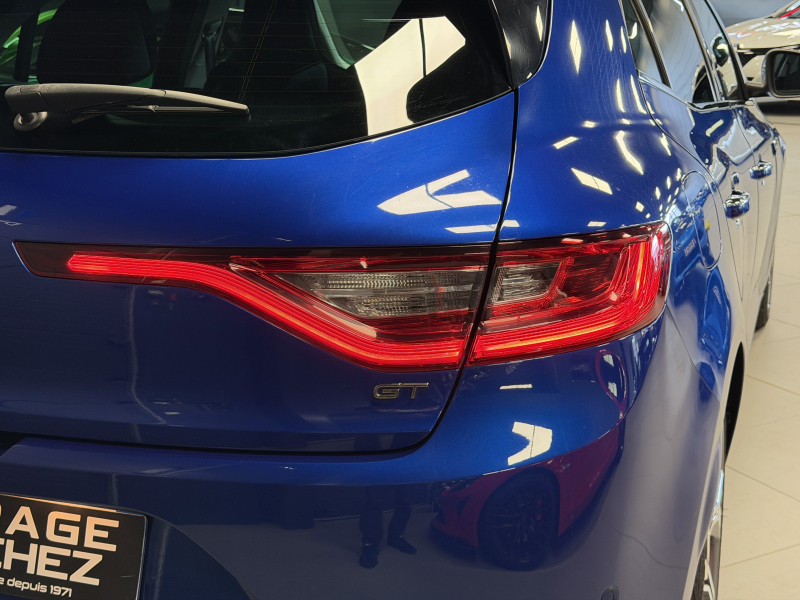 Agent Renaut vend une Megane GT dans une configuration Bleu Iron qui dispose d'un silencieux tube GT Performance, toit ouvrant panoramique, affichage tête haute, easy park assist incluant la caméra de recul ainsi que les radars 360°, jantes Magny Cours 18 , antenne requin, sellerie alcantara, sièges avant chauffants, carte mains libre, alerte de franchissement de ligne, avertisseur d'angles morts, régulateur de vitesse adaptatif, Apple CarPlay & Android Auto, GPS, radio, bluetooth, BOSE,