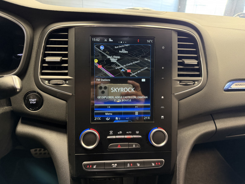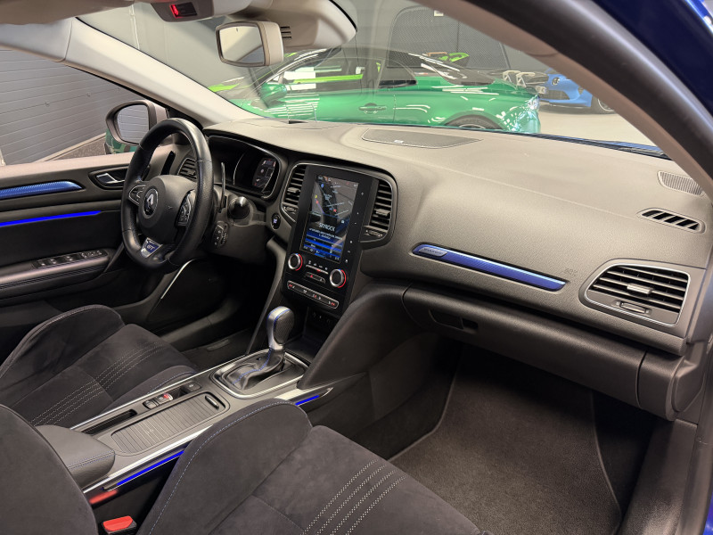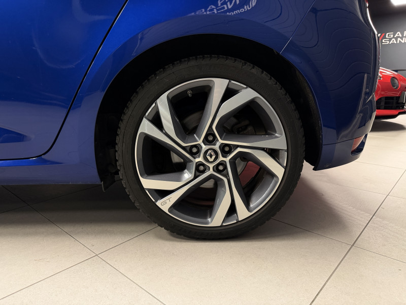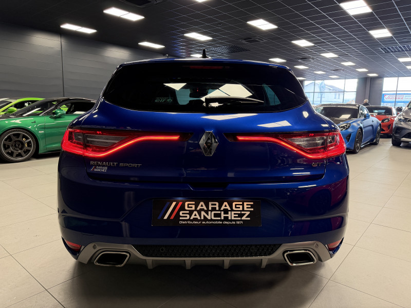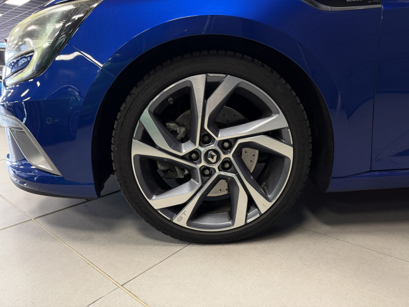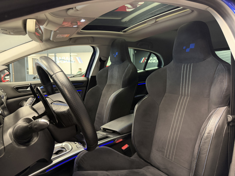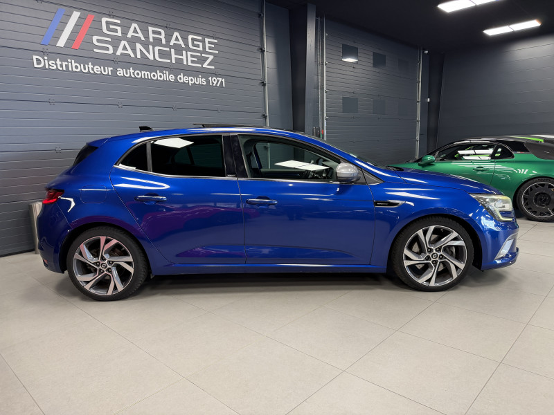 Agent Renaut vend une Megane GT dans une configuration Bleu Iron qui dispose d'un silencieux tube GT Performance, toit ouvrant panoramique, affichage tête haute, easy park assist incluant la caméra de recul ainsi que les radars 360°, jantes Magny Cours 18 , antenne requin, sellerie alcantara, sièges avant chauffants, carte mains libre, alerte de franchissement de ligne, avertisseur d'angles morts, régulateur de vitesse adaptatif, Apple CarPlay & Android Auto, GPS, radio, bluetooth, BOSE,