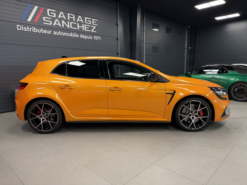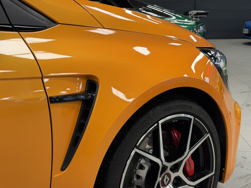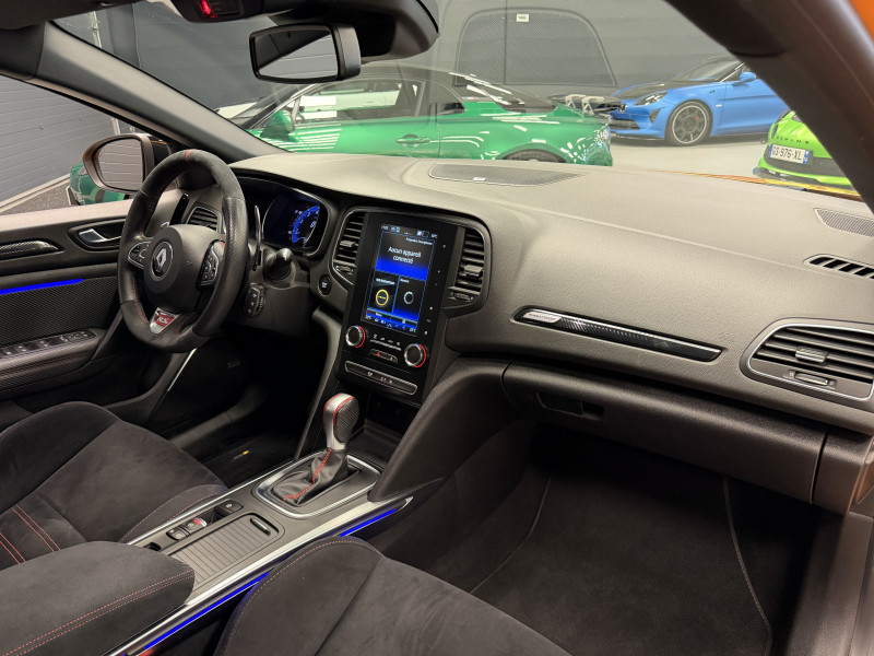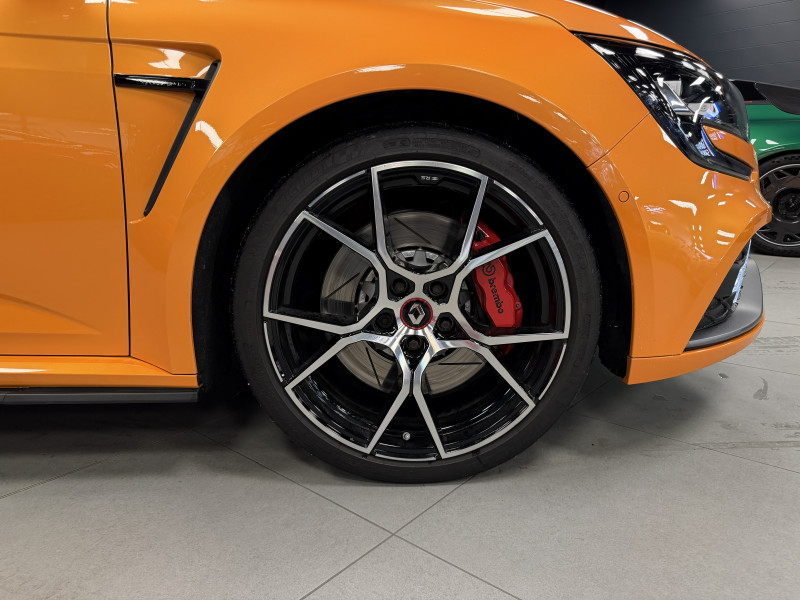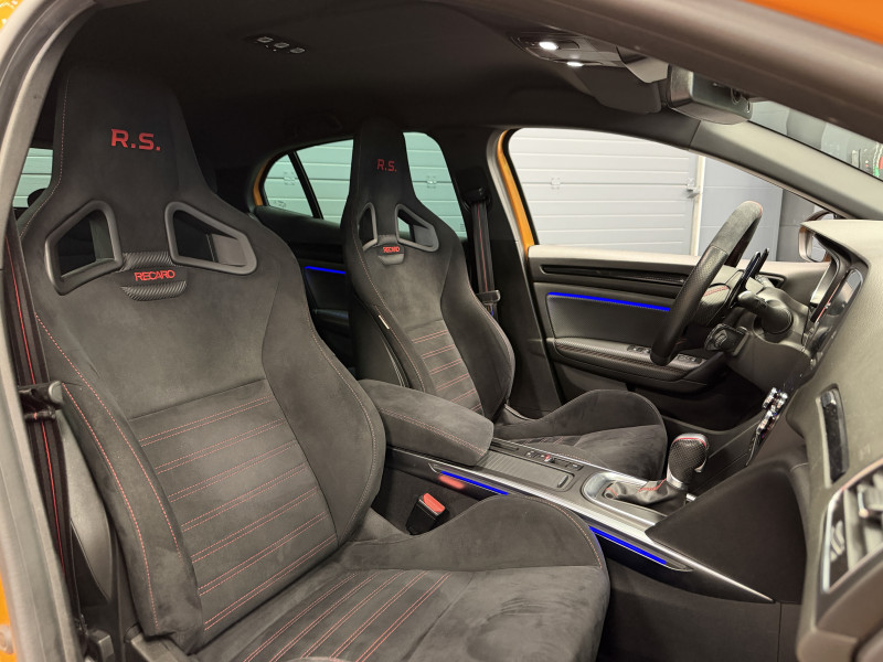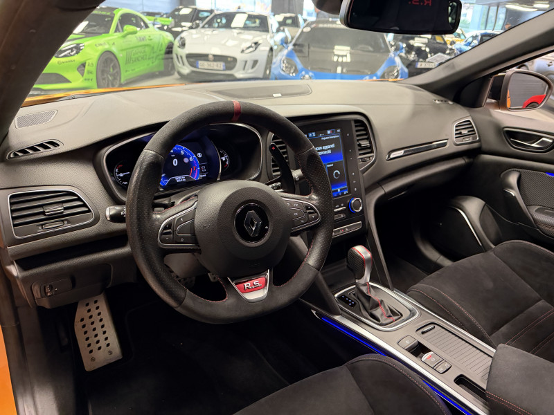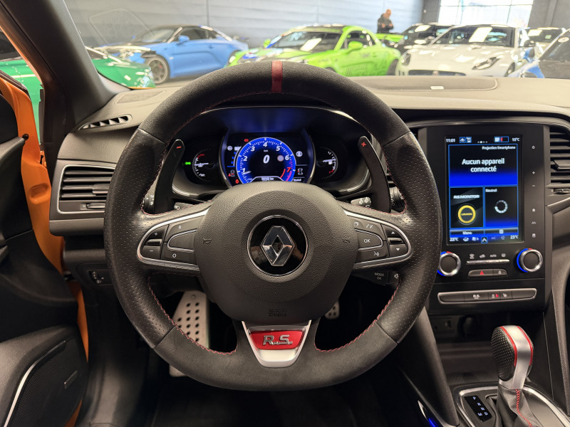 Agent Renault vend une Megane 4 RS dans une configuration Orange Tonic qui dispose du châssis CUP, frein bi-matière, covering du toit en noir, déchromage complet des contours de vitres et des poignées de portes, easy park assist incluant la caméra de recul ainsi que les radars 360°, jantes 19 fujilight, étriers de frein rouge, antenne requin, sièges Recaro alcantara, volant cuir/alcantara, ciel de toit noir, carte mains libre, alerte de franchissement de ligne, régulateur de vitesse, Apple CarPlay & Android Auto, radio, bluetooth, BOSE, climatisation automatique