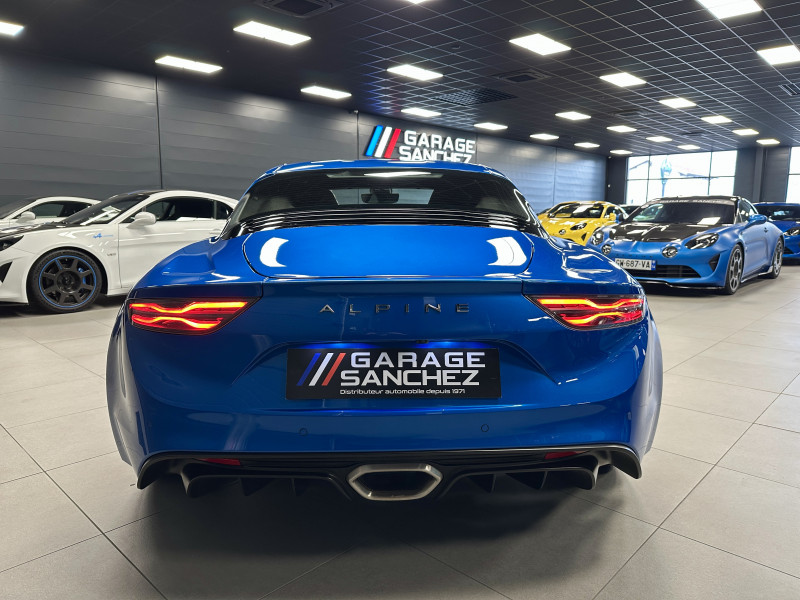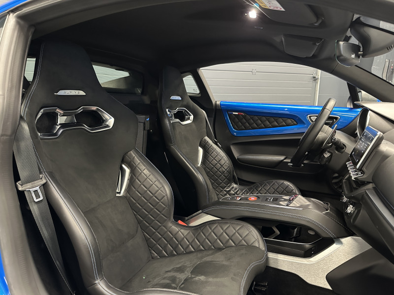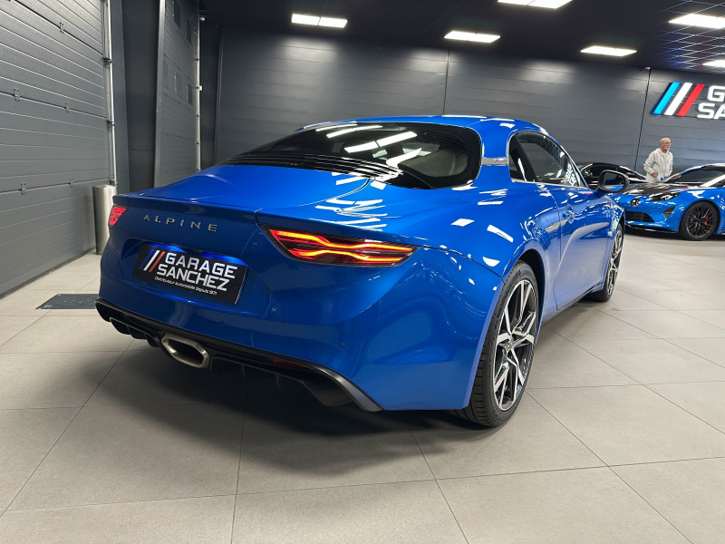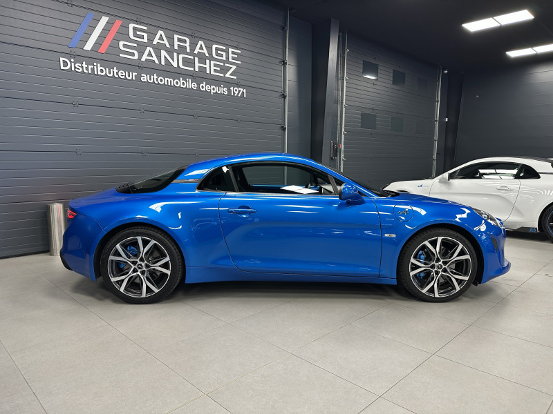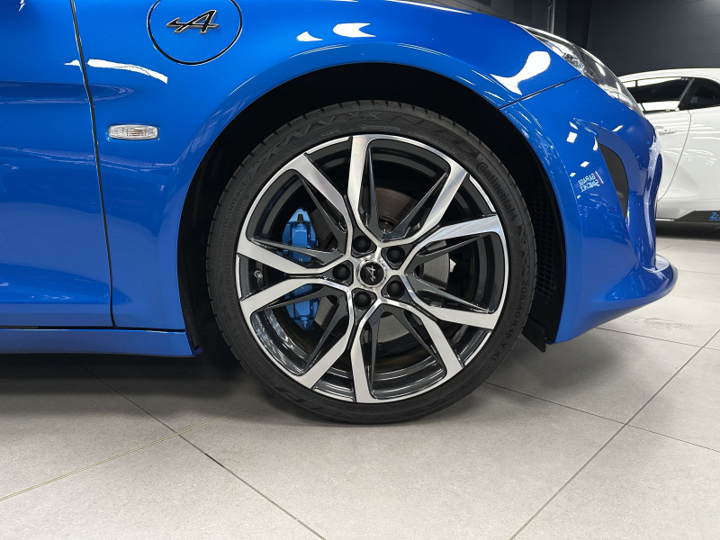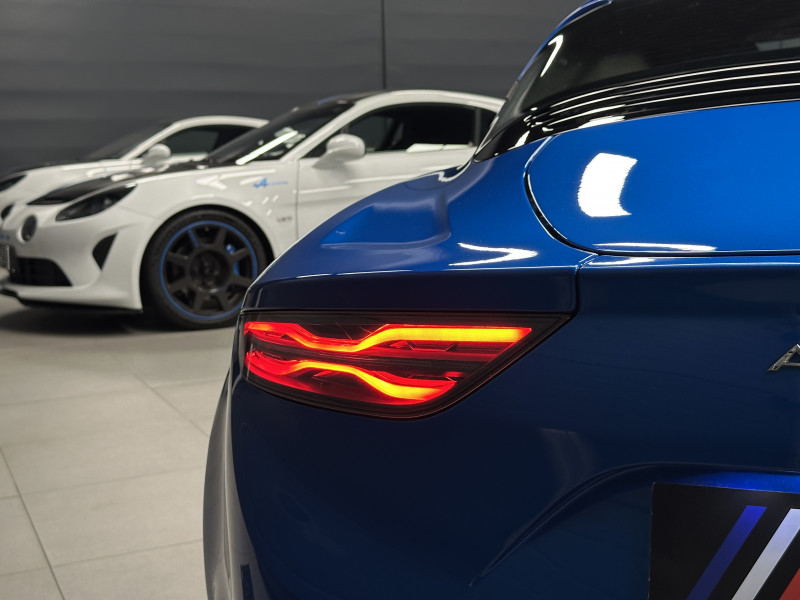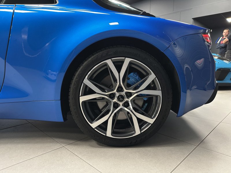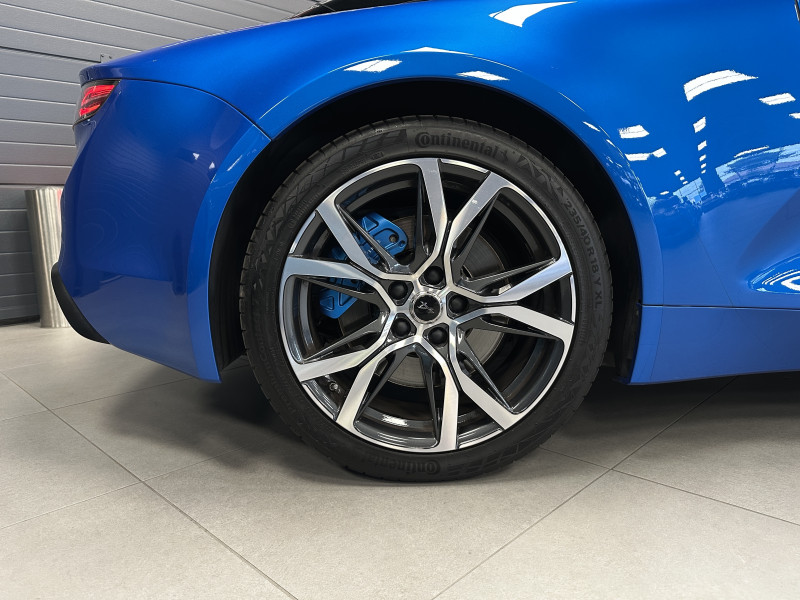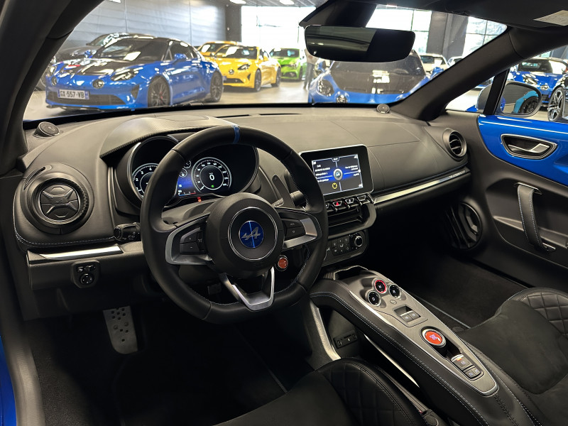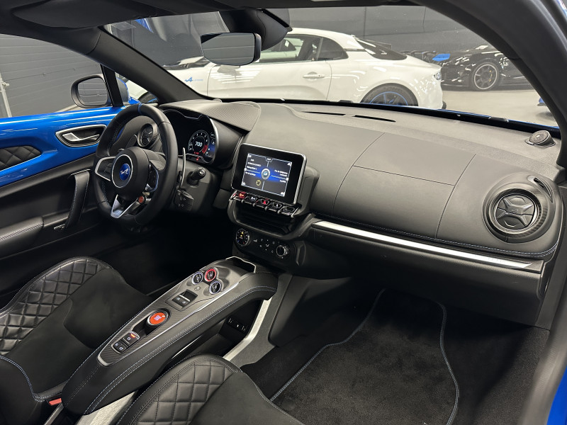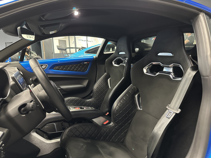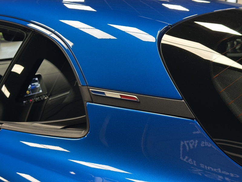 Agent Renault vend une Alpine A110 dans une configuration Bleu Alpine qui dispose de l'échappement sport, kit gros freins, caméra de recul, radars avant/arrières, jantes 18 Sérac Diamantées, étriers de frein bleu, centres de roues noires, drapeau Français sur les montant et à l'intérieur des portes, pack carbone intérieur, pack Focal, sièges Sabelt en cuir/alcantara, ciel de toit noir, logo bleu au centre du volant, pédalier aluminium, tapis de sol Alpine, rétroviseurs rabattables électriquement, rétroviseur éléctrochrome, carte mains libre, régulateur/limiteur de vitesse, GPS, radio, Bluetooth, climatisation automatique