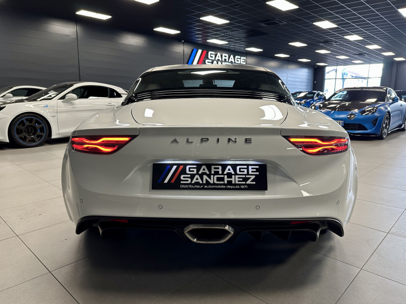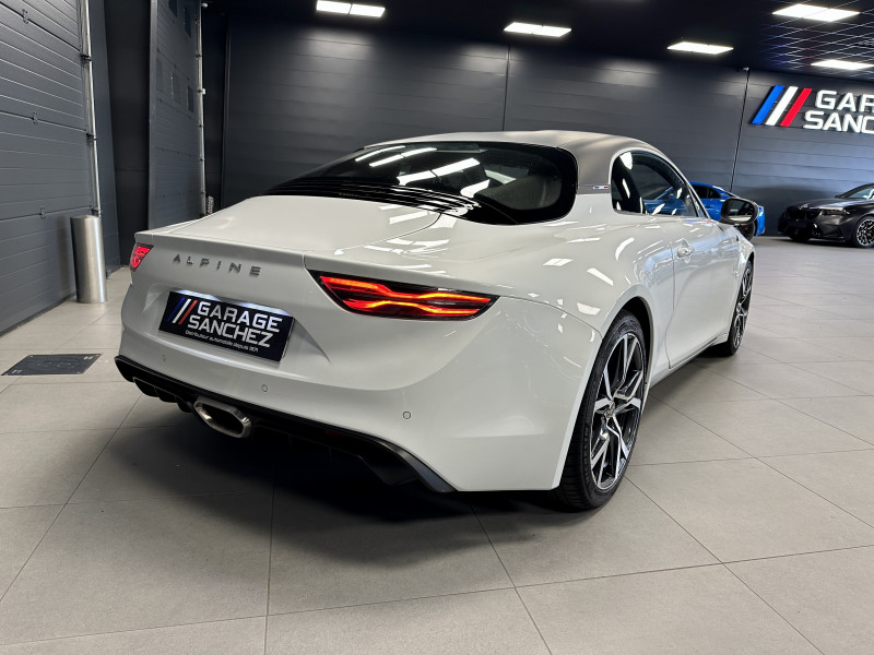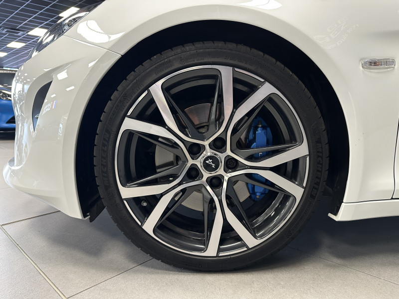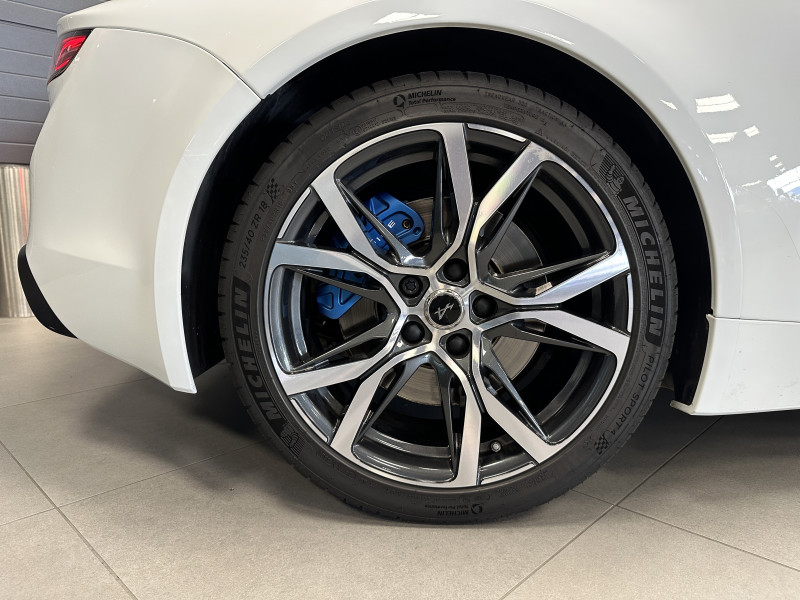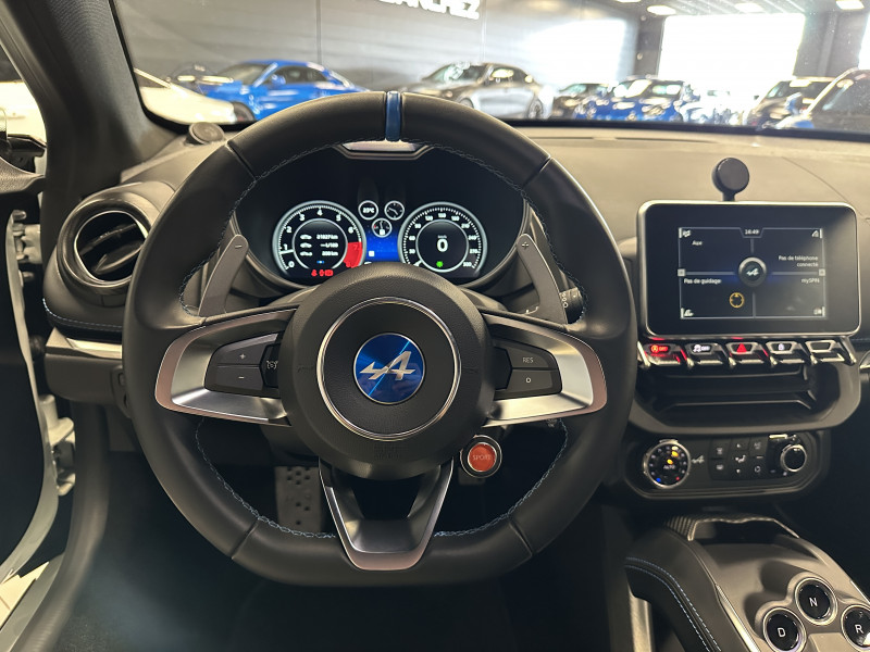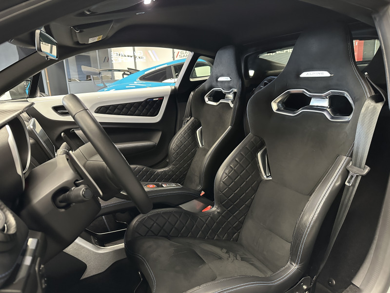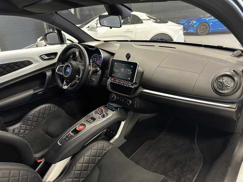 Agent Renault vend un véhicule dans une configuration Blanc Glacier qui dispose d'un covering noir mat sur le toit et les montants (possibilité de le retirer pour la vente), échappement sport, kit gros freins, radars avant/arrières, jantes 18 Sérac Diamantées, étriers de frein bleu, centres de roues noires, drapeau Français sur les montant et à l'intérieur des portes, pack carbone intérieur, pack Focal, sièges Sabelt en cuir/alcantara, ciel de toit noir, logo bleu au centre du volant, pédalier aluminium, tapis de sol Alpine, carte mains libre, régulateur/limiteur de vitesse, GPS, radio, Bluetooth, climatisation automatique