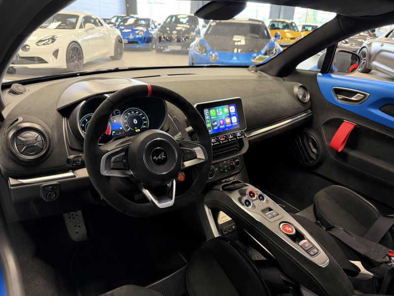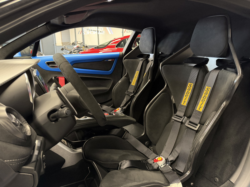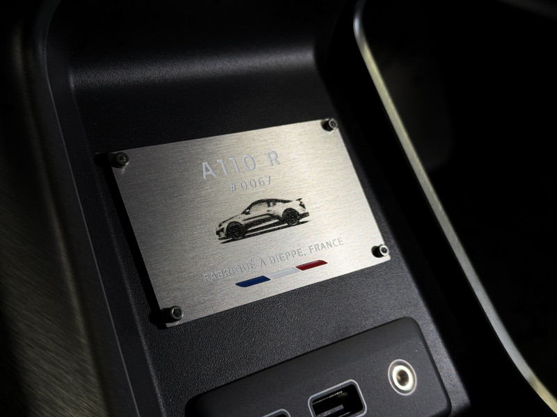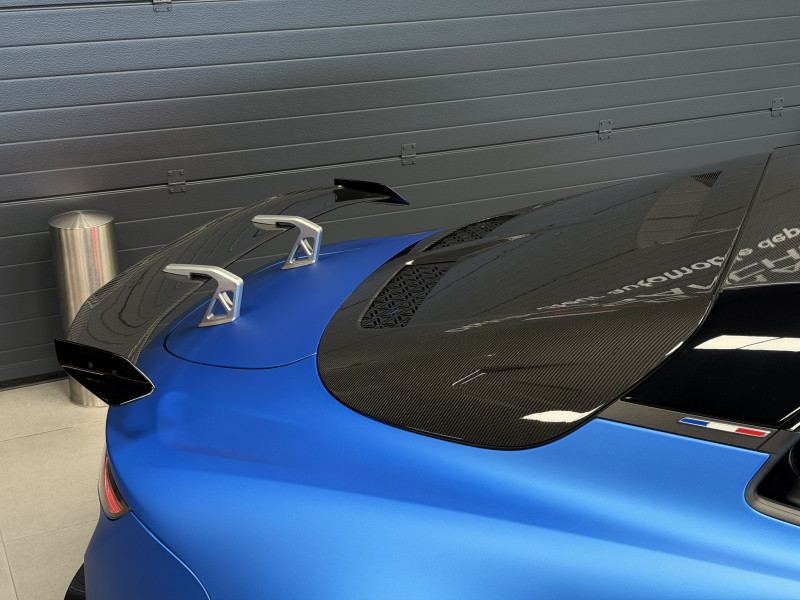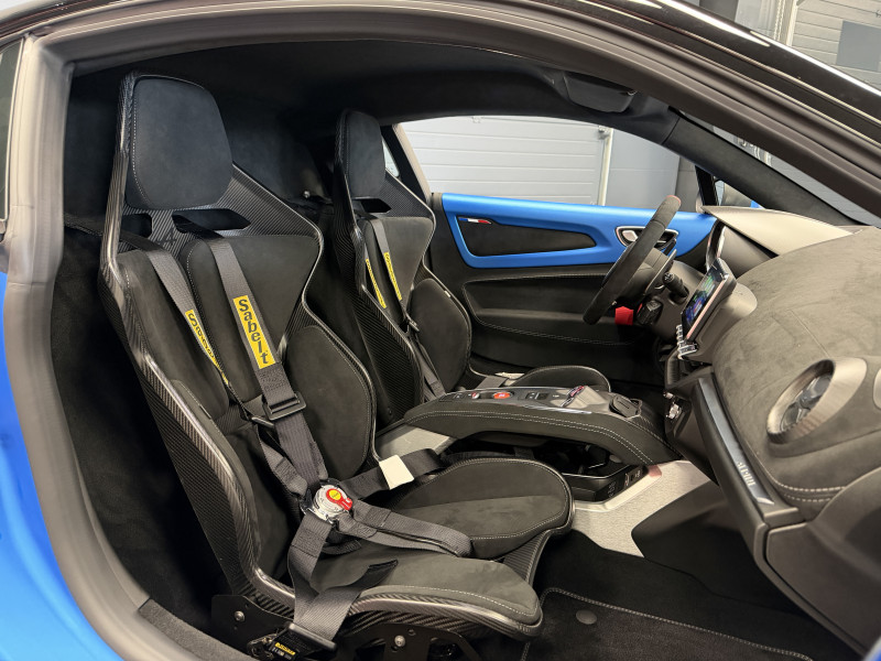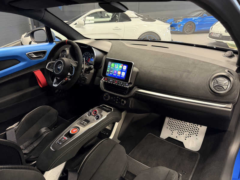 Agent Renault vend une Alpine A110 R Jantes carbone N°0067 dans une configuration Bleu Racing Mat qui dispose des montants contrastants noir, étriers de frein rouge, caméra de recul, pack Focal, pack carbone intérieur, pack microfibre, sièges Sabelt full carbone, harnais Sabelt, volant alcantara, ciel de toit dinamica, carte mains libre, pédalier aluminium, repose pieds passager aluminium, tapis de sol Alpine, régulateur/limiteur de vitesse, Apple CarPlay & Android Auto, GPS, radio, bluetooth, climatisation automatique