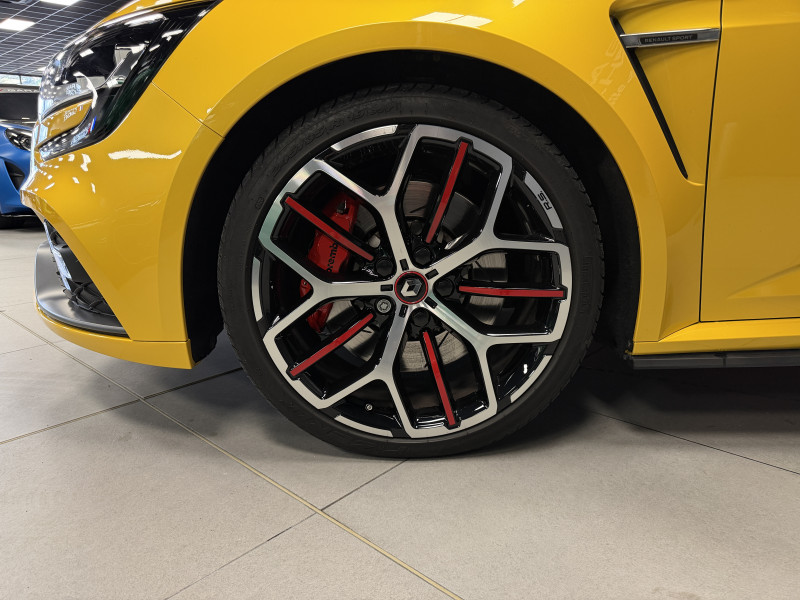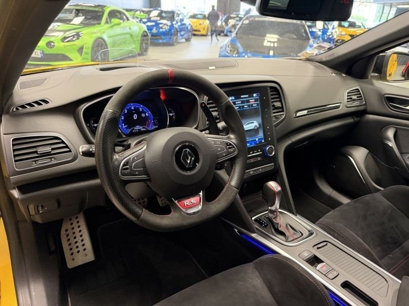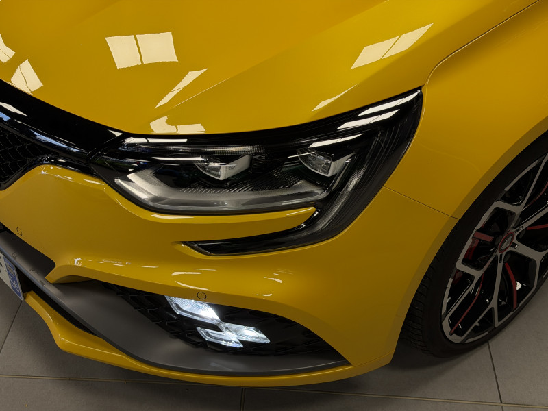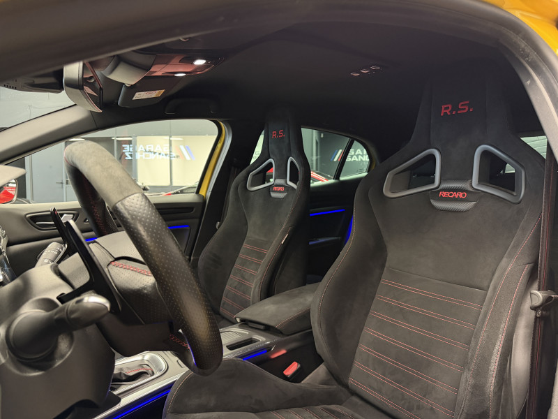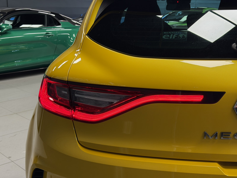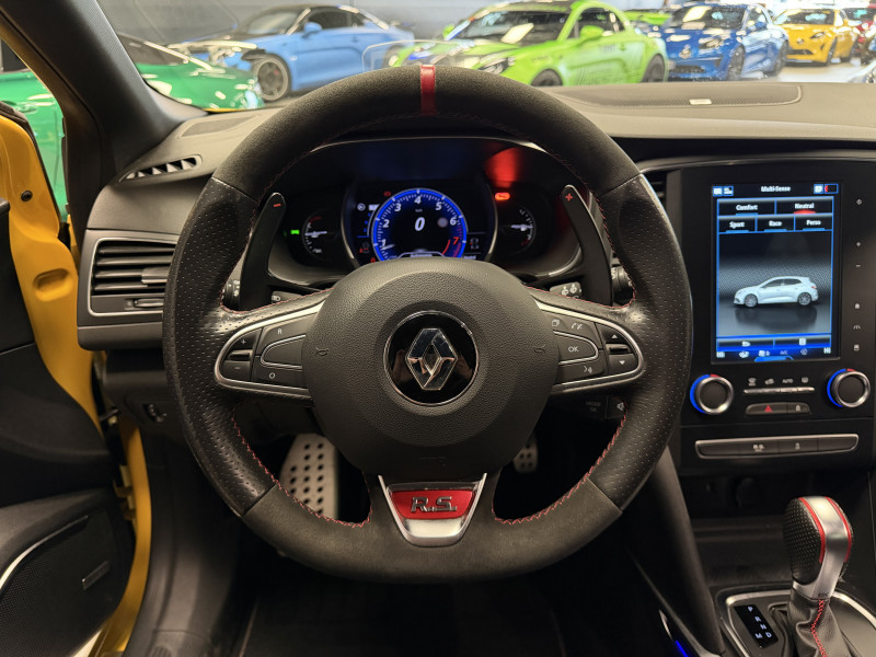 Agent Renault vend une Megane 4 RS dans une configuration Jaune Sirius qui dispose du châssis CUP, frein bi-matière, affichage tête haute, easy park assist incluant la caméra de recul ainsi que les radars 360°, jantes 19 fujilight, étriers de frein rouge, antenne requin, sièges Recaro alcantara, volant cuir/alcantara, ciel de toit noir, carte mains libre, alerte de franchissement de ligne, régulateur de vitesse adaptiatif, Apple CarPlay & Android Auto, radio, bluetooth, BOSE, climatisation automatique