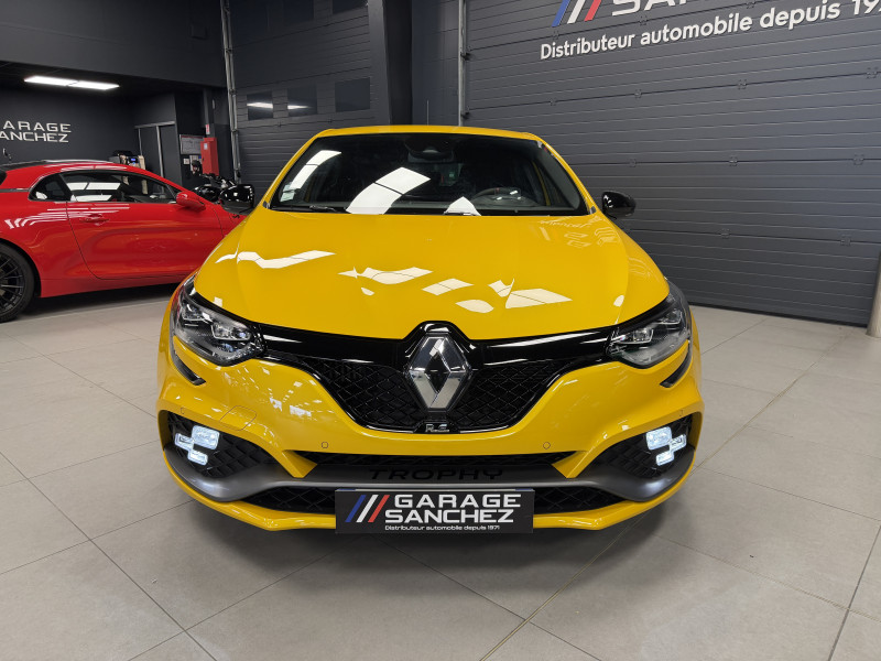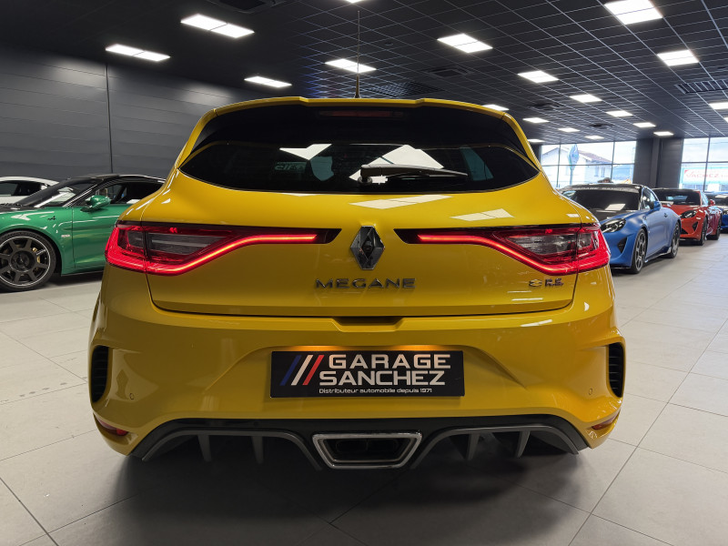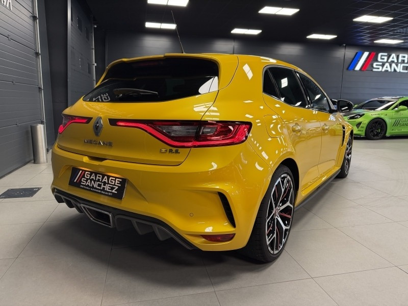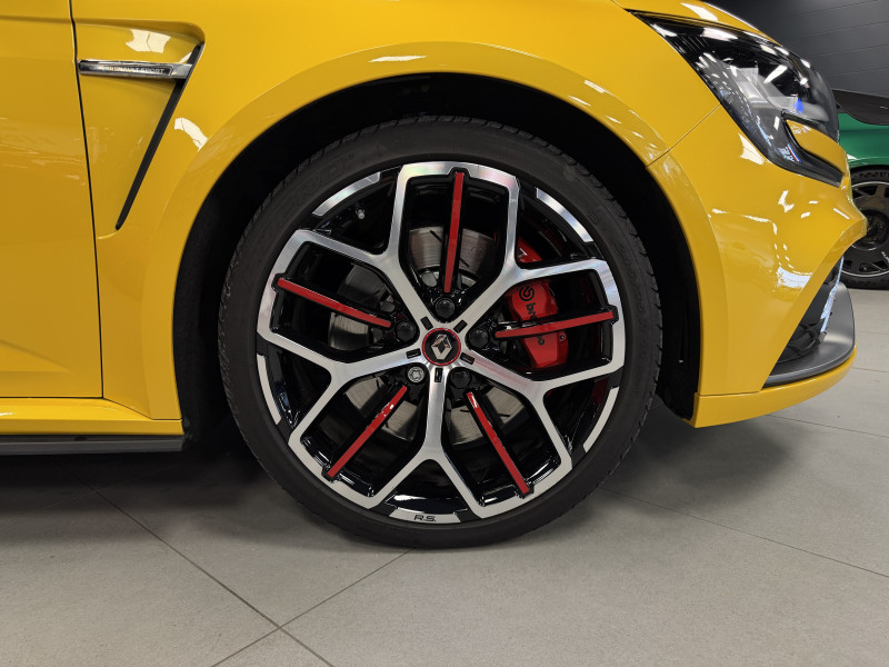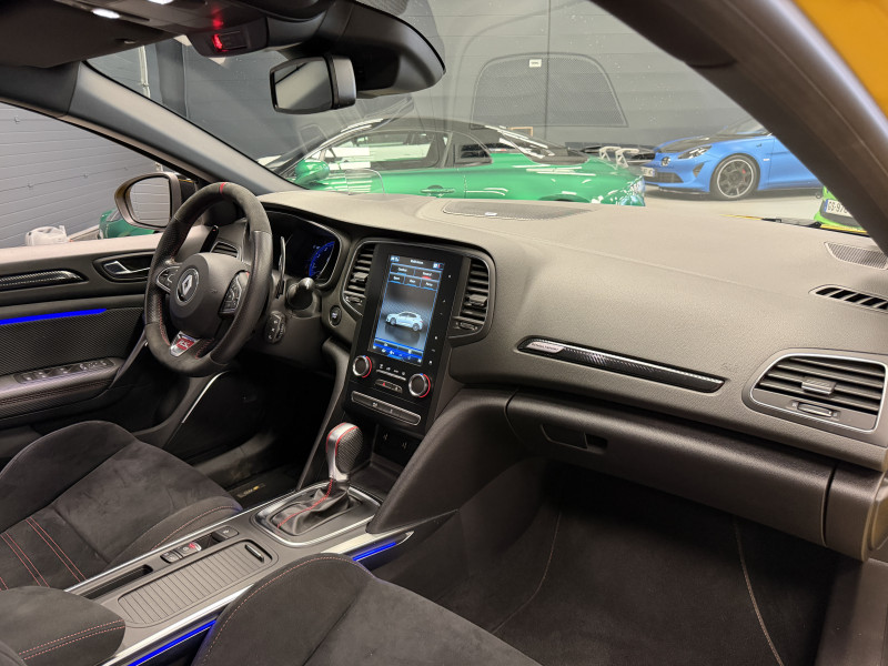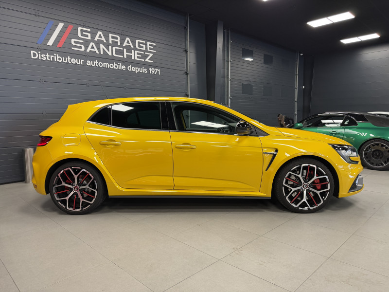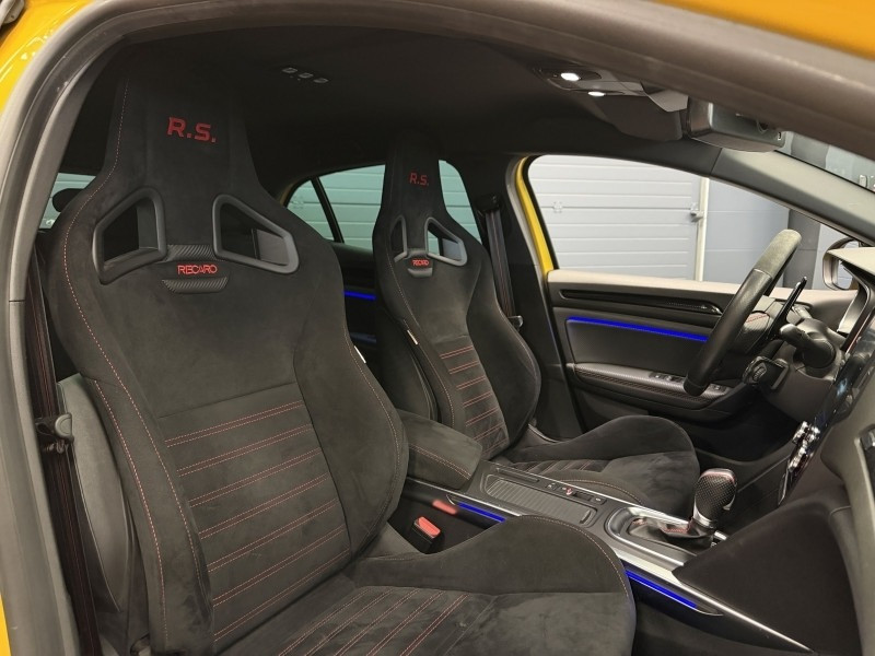 Agent Renault vend une Megane 4 RS dans une configuration Jaune Sirius qui dispose du châssis CUP, frein bi-matière, affichage tête haute, easy park assist incluant la caméra de recul ainsi que les radars 360°, jantes 19 fujilight, étriers de frein rouge, antenne requin, sièges Recaro alcantara, volant cuir/alcantara, ciel de toit noir, carte mains libre, alerte de franchissement de ligne, régulateur de vitesse adaptiatif, Apple CarPlay & Android Auto, radio, bluetooth, BOSE, climatisation automatique