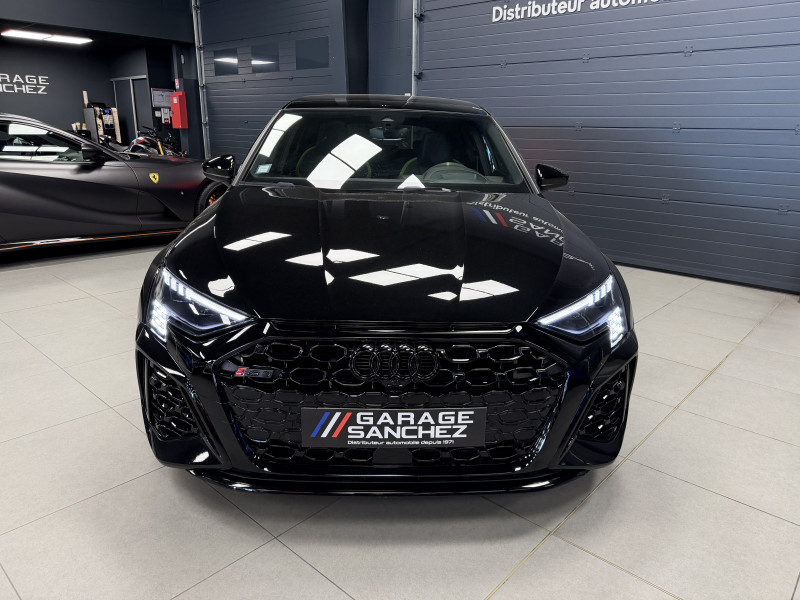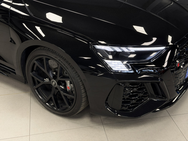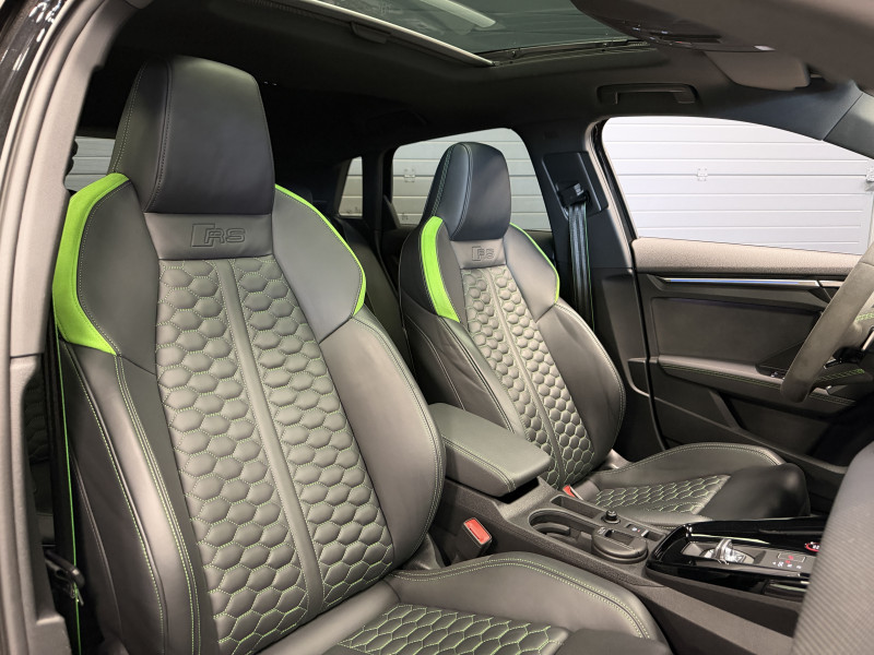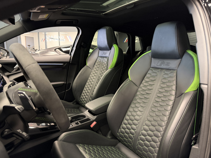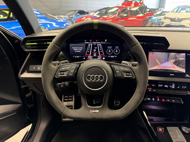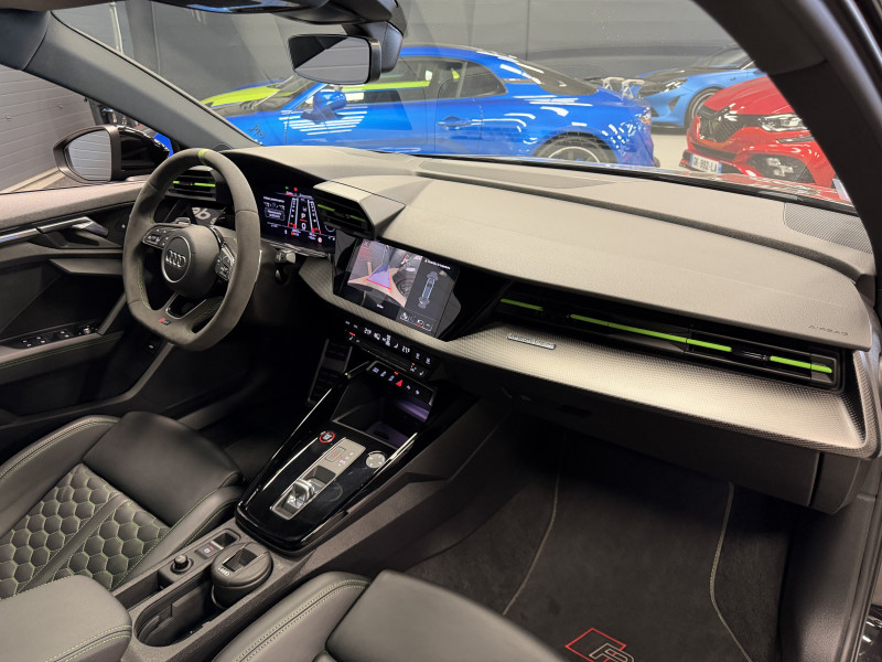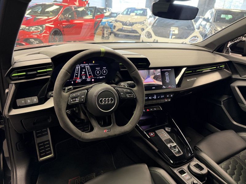 Agent Renault vend une Audi RS3 8Y dans une configuration Noir Mythic qui dispose des freins céramique, toit ouvrant panoramique, échappement RS, feux Matrix LED, clignotants dynamiques, pack RS Dynamic Plus, V-MAX 290 KM/H, jantes 19 avec les étriers Gris, caméra de recul, radars avant/arrières, hayon électrique, Sono Bang & Olufsen 3D, affichage tête haute, Pack RS Design Etendu Vert, pack carbone Mat intérieur, sellerie cuir, sièges avant électriques et chauffants, volant alcantara, ciel de toit noir, virtual cockpit plus, keyless, audi drive select, pack assistance, lane assist, ACC (régulateur de vitesse adaptatif), Apple CarPlay & Android Auto, climatisation automatique
