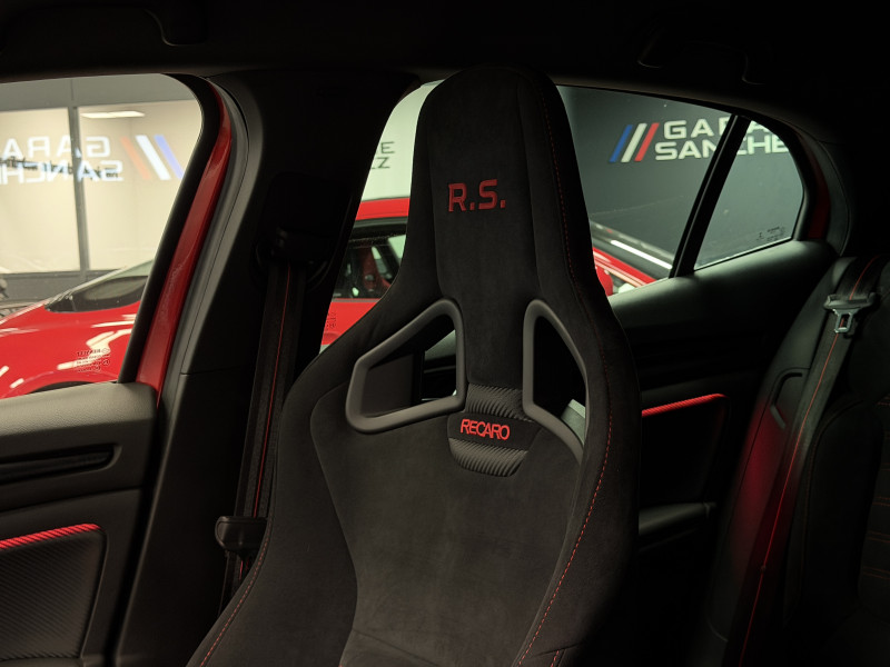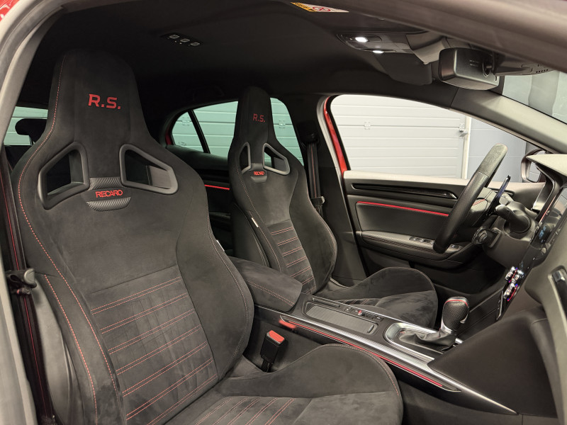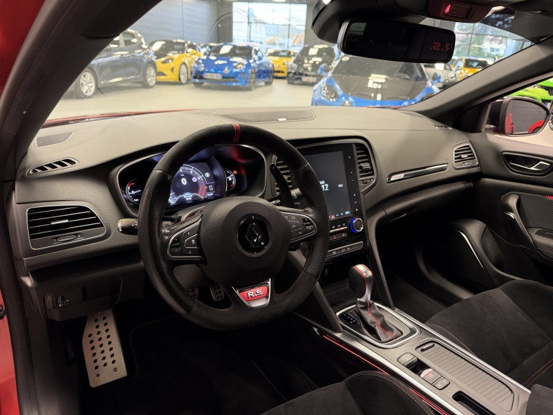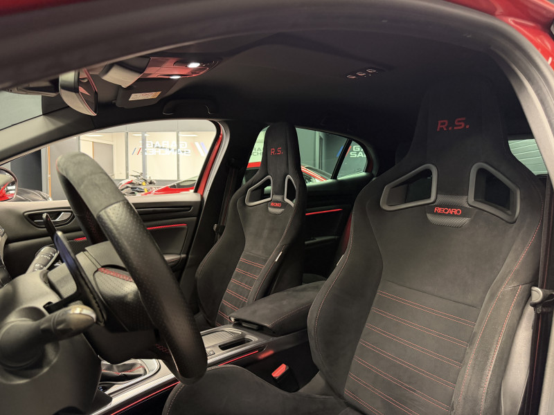 Agent Renault vend une Megane 4 RS dans une configuration Rouge Flamme qui dispose du châssis CUP, frein bi-matière, protection PPF complet, jantes OZ Superturismo avec centerlock, lame avant et becquet Maxton Design, déco Trophy, black pack/black badge complet, easy park assist incluant la caméra de recul ainsi que les radars 360°, sièges Recaro alcantara, volant cuir/alcantara, ciel de toit noir, carte mains libre, alerte de franchissement de ligne, régulateur de vitesse adaptatif, Apple CarPlay & Android Auto, GPS, radio, bluetooth, BOSE, climatisation automatique