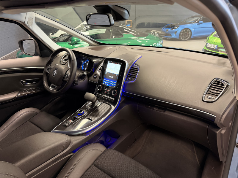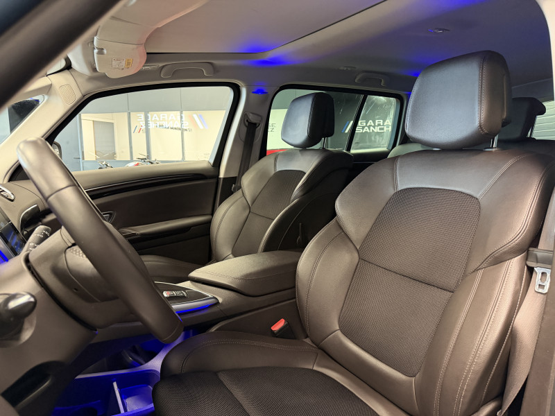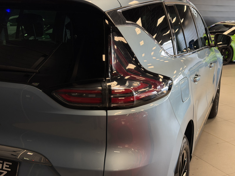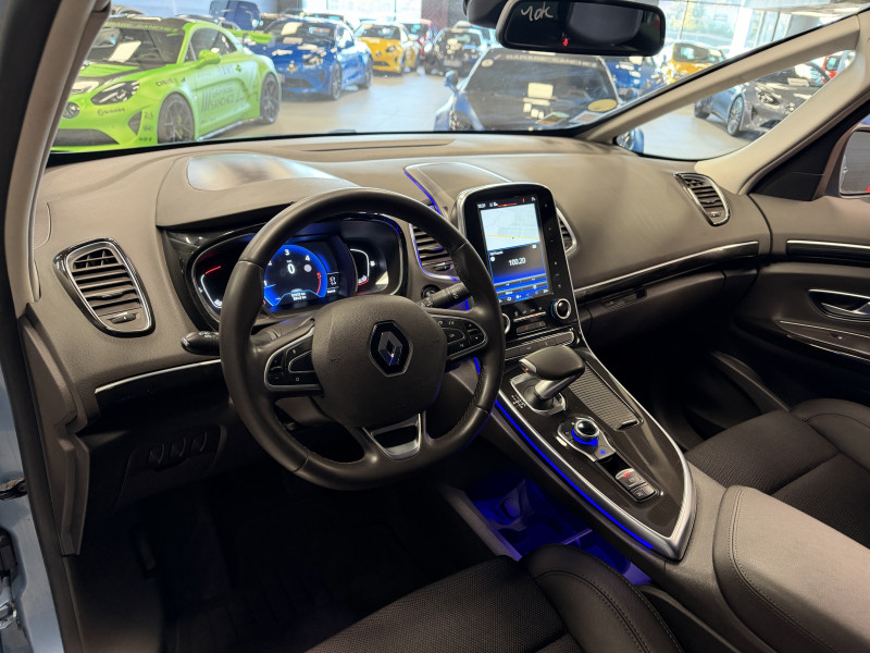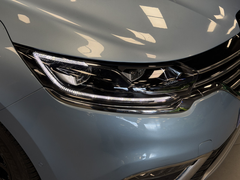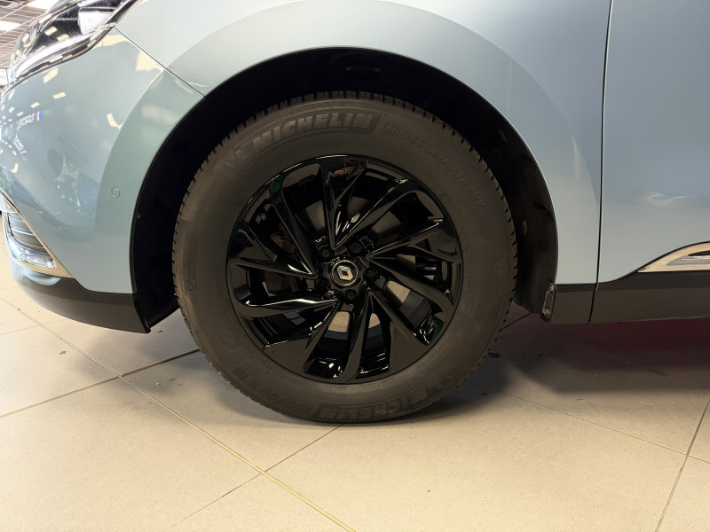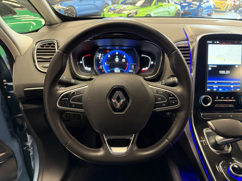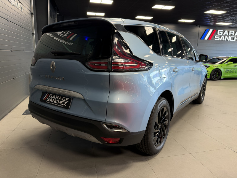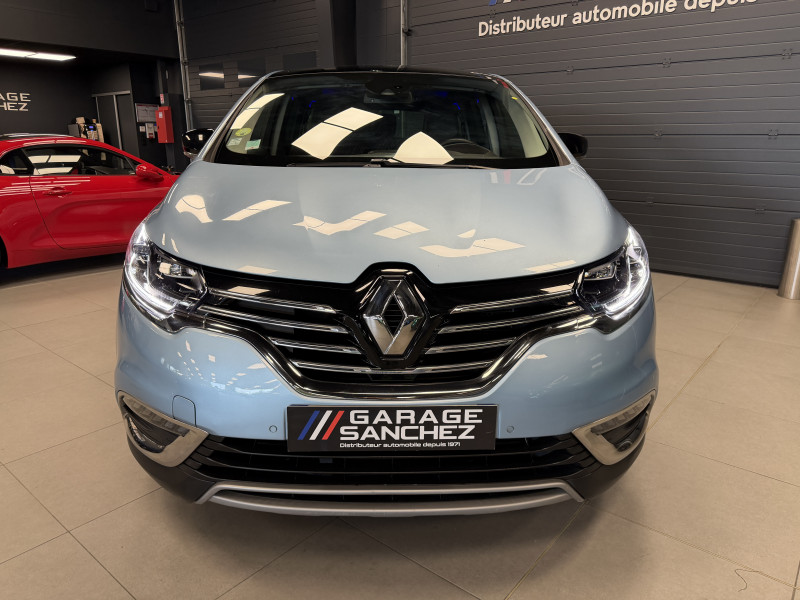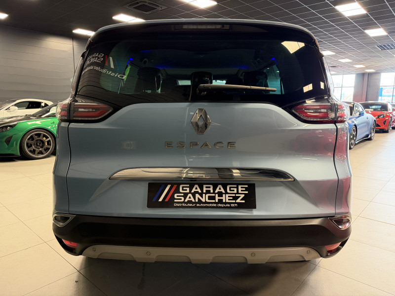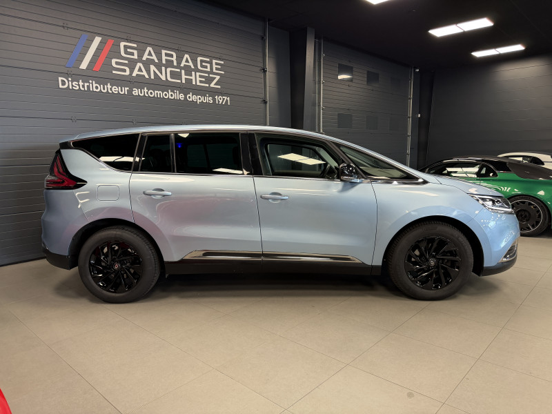 Agent Renault vend un Espace 5 dans une configuration Bleu Céleste qui dispose d'un black pack incluant les 4 jantes noires, toit panoramique, caméra de recul, radars 360°, jantes 18 Lapiaz Full Black, pack ambiance lumineuse, intérieur brun foncé, sellerie cuir/tissu, sièges électriques, carte mains libre, alerte de franchissement de ligne, avertisseur d'angles morts, régulateur/limiteur de vitesse, GPS, radio, bluetooth, climatisation automatique, roue de secours